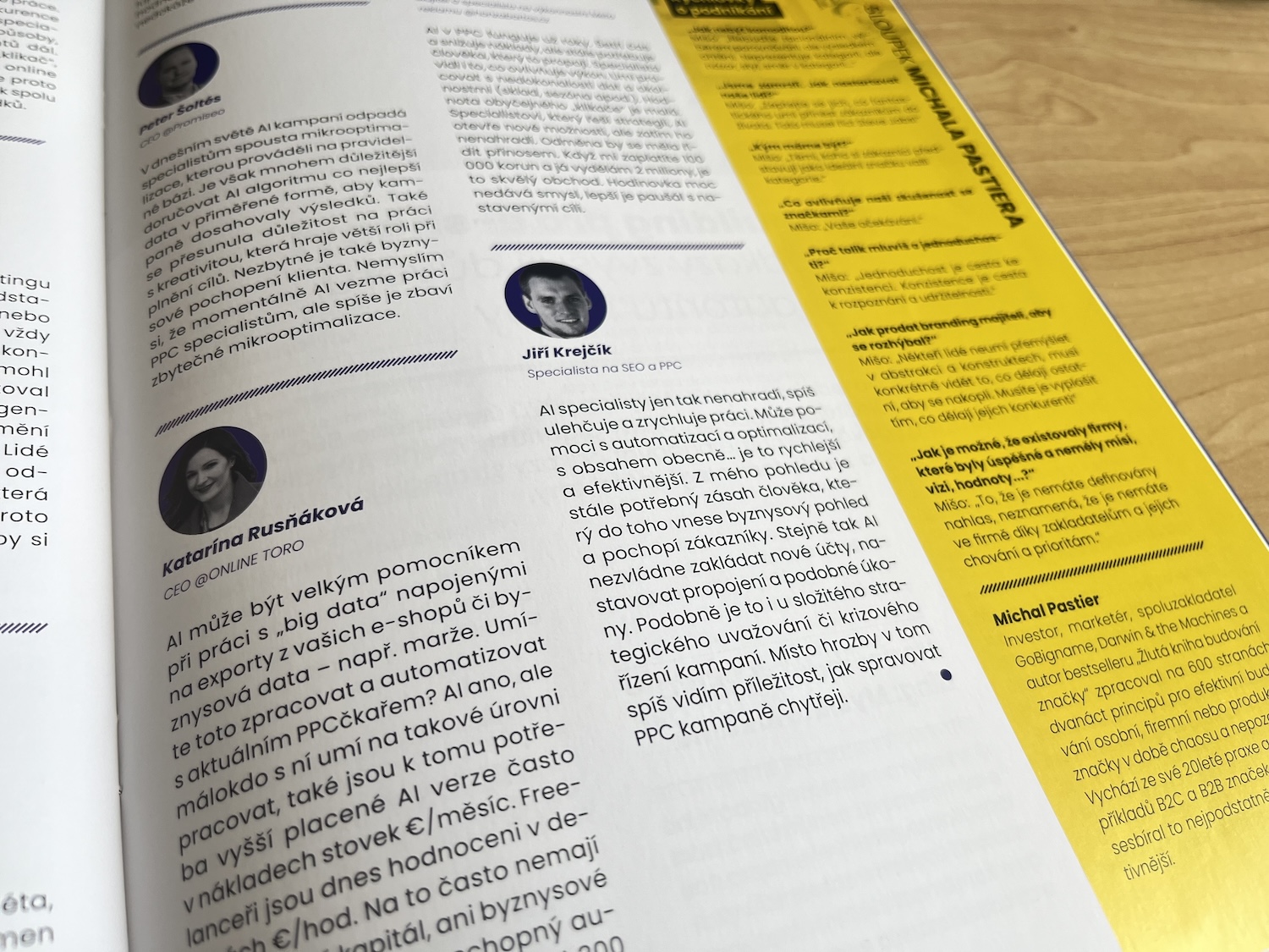 Zastávám názor, že svým klientům víc prospěju soustředěnou prací a sebevzděláváním než budováním ega v podcastech, na rautech a konferencích. Tu a tam ale nějaký ten rozhovor poskytnu a nějakou tu přednášku odprezentuju. Výstupy najdete na této stránce.